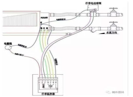 ◆ 图中黑线为二通阀火线接入温控器“开”路接口;艳红线为二通阀接入温控器“关”路接口;