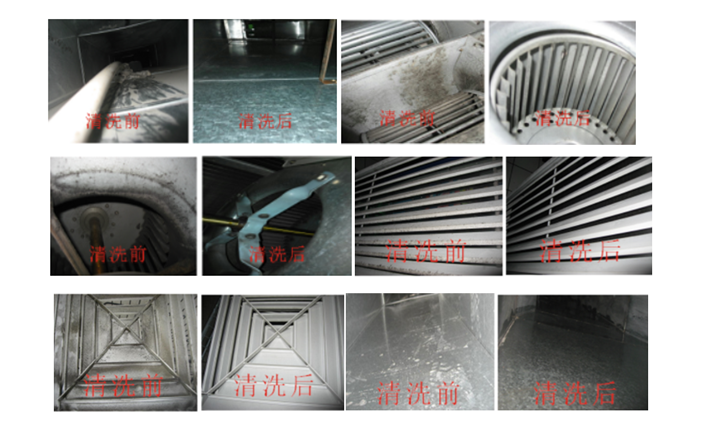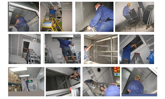 长沙某大型超市中央空调公共区域采用“水冷机组+空气处理机”的全空气处理系统,共有空气处理机19台,局部区域如员工办公室、档案室等采用风机盘管,共有风机盘管26台。中央空调投入使用已3年多,甲方委托我司对风系统进行清洗保养服务,此次共清洗空气处理机19台、风机盘管26台,清洗风管约7500平米(展开面积),清洗空调风口300多个。以下为清洗实施方案: