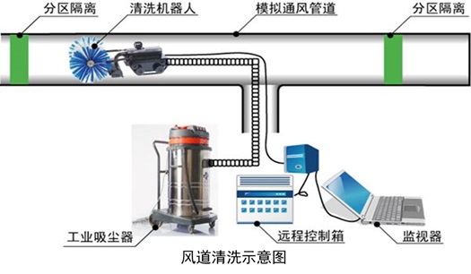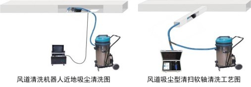 (3)在狭小的风道内,清扫机器人体积过大进不去,就要使用吸尘型软轴做清扫扬尘,并同时进行吸尘处理(清扫支风道)。