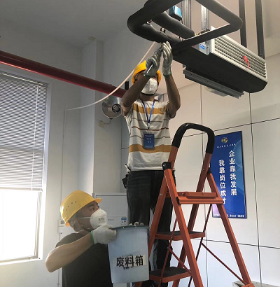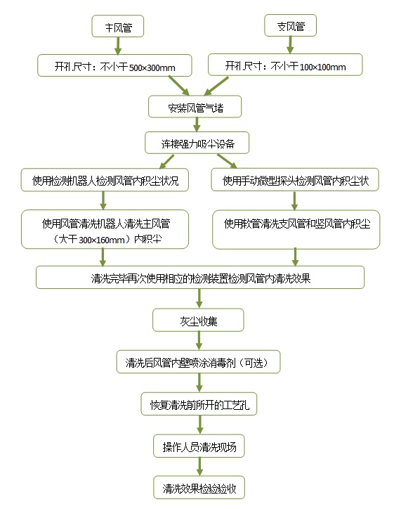 (1)对风道规格大于1000mm×550mm以上、出风口无法封堵等情况均采用近地吸尘清洗工艺完成。