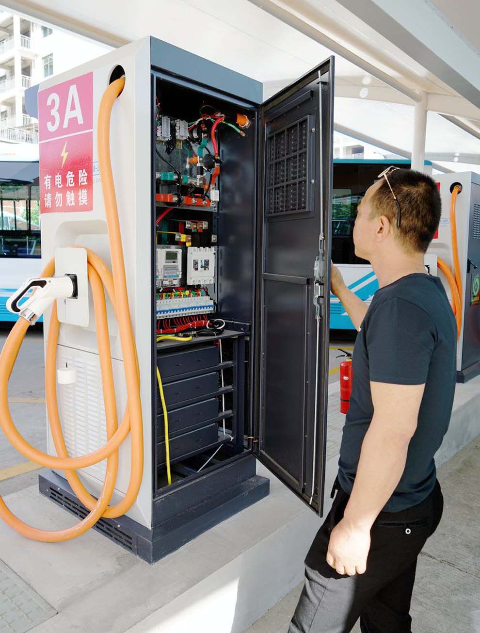 该充电站配备了120kw直流充电桩机组20台,90kw直流充电机桩10台,现代化膜结构停车棚1000余平方米。可同时对50台新能源电动公交车进行充电服务,24小时可以累计完成300余台新能源电动公交车充电服务。