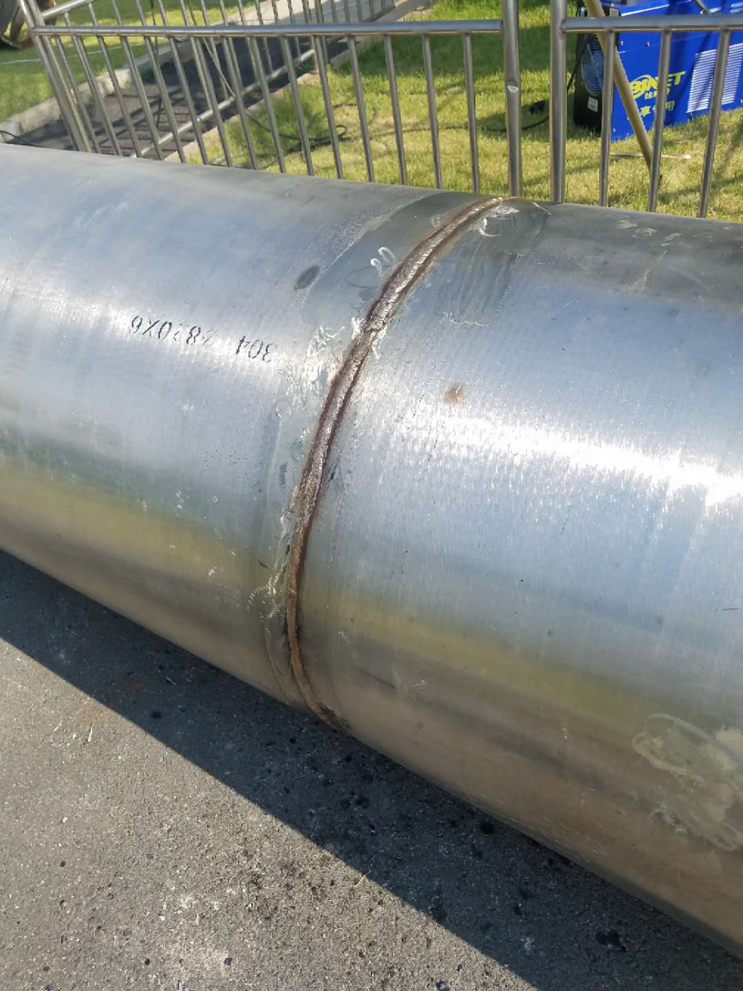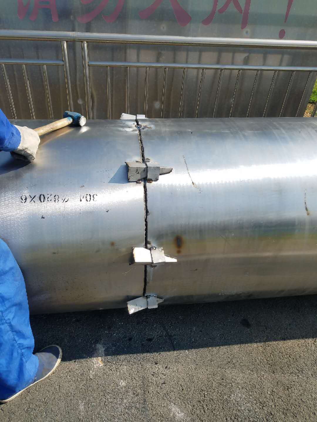半成品到达现场后,我司专业施工人员对烟囱先对照已绘制好的组装图纸开始进行焊接组装,在开始焊接组装时,由于不锈钢管道较厚,为了保证焊接质量和让焊缝焊透使焊接牢固,现场在焊口对接位用坡口机进行打坡口,合格后再焊接