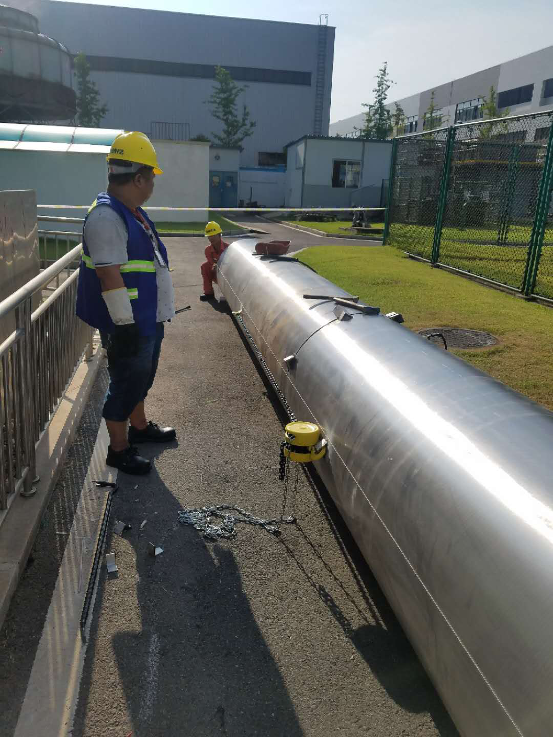 拆除完毕后,对原有基础进行处理,处理好后对新不锈钢主烟囱吊装就位调直