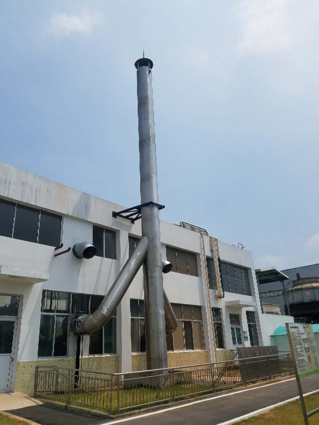 安装完成后,烟囱的高度有16m高,根据长沙市防雷办要求,烟囱必须防雷接地,且达到防雷要求,要求现场检测电阻值不能大于4欧。在不锈钢烟囱帽上安装避雷针一枚,利用不锈钢烟囱作为引下线。在烟囱底部与原有防雷接地50*5扁钢搭接,安装完毕后经现场电气工程师用防雷接地电阻测试仪遥测电阻为1.5Ω,此电阻值小于4Ω,符合防雷规范《电气装置安装工程接地装置施工及验收规范》(GB50169-92)要求,达到验收标准