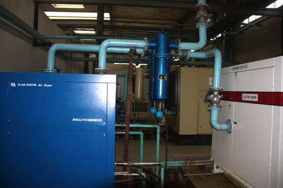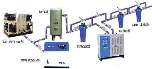 生产线动力压缩空气供应站大多采用螺杆、离心式水冷方式实现对空气压缩后经过滤、储压分配到各车间的生产线作加工动力用。