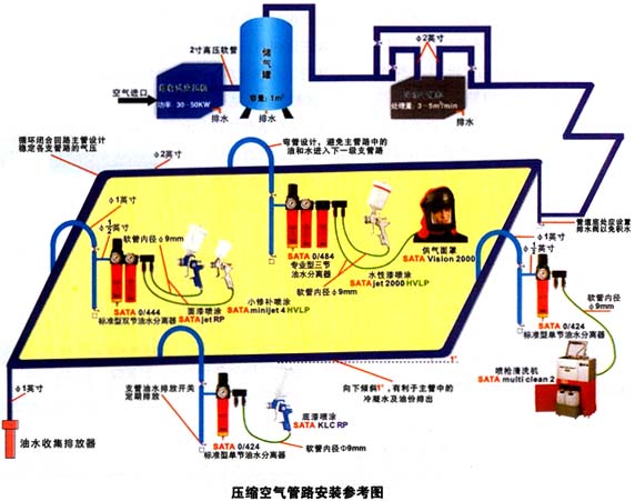 5、压缩空气管道安装完毕后,应进行强度和严密性试验,试验介质一般为水。当工作压力P<0.5MPa时,试验压力Ps=1.5P,但Ps ≮0.2MPa; 当工作压力P≥0.5MPa时,试验压力Ps=1.25P,但Ps≮ P+0.3MPa。管路在试验压力下保持20分钟作外观检查,然后降至工作压力进行严密性实验,无渗漏即为合格。
