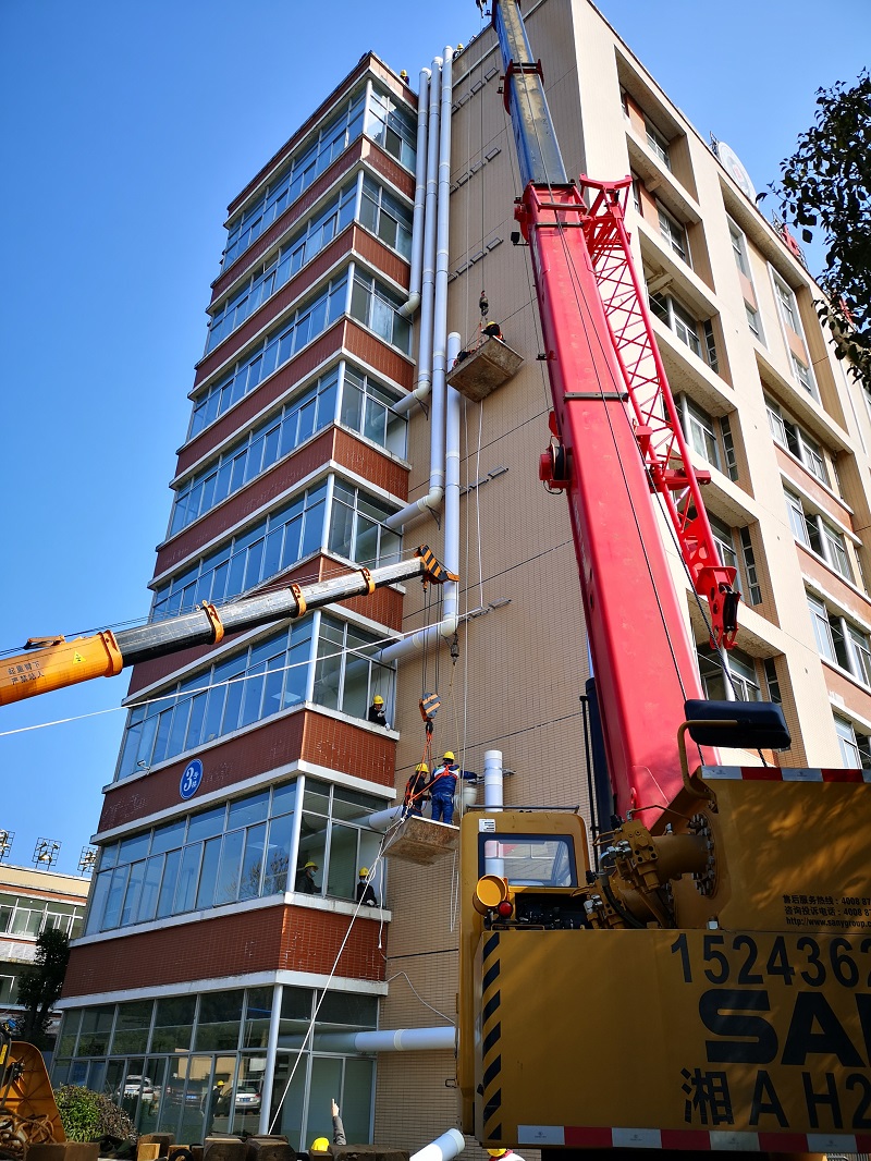 在现场指挥部的紧密组织下,我们迅速调集路口镇周边班组50名工人,财务采购排风电话、微信到处寻找风管材料和配件于下午五点到达工地,工人师傅连夜加班,把进度往前赶,为争取第二天基本完成整栋八层的公共区域新风管道安装卯足了干劲。