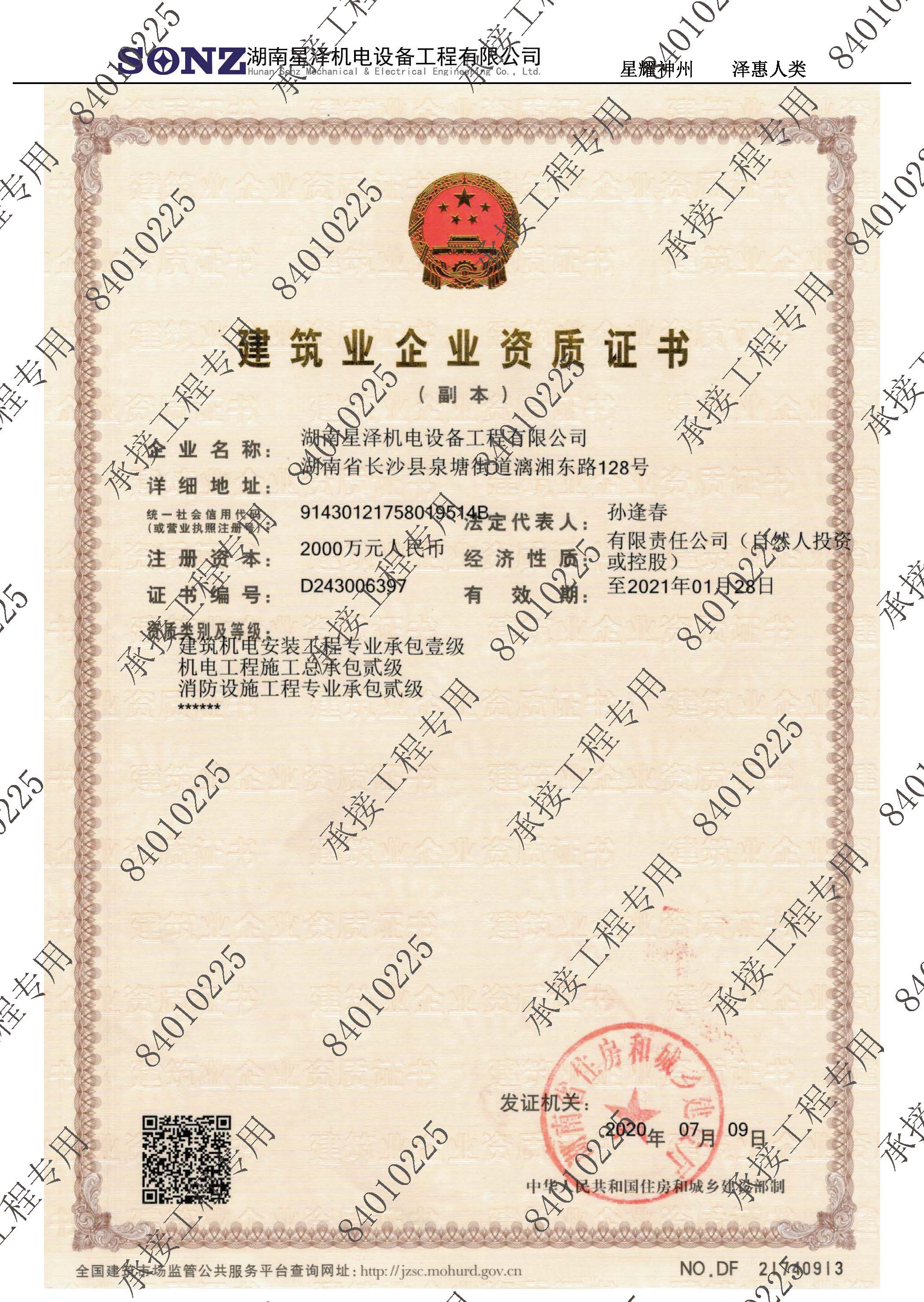 热烈祝贺湖南星泽机电设备工程有限公司荣升机电专业承包一级资质