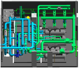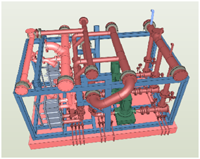 2) 按照厂家提供的机组、水泵等设备和阀门、过滤器等附件的尺寸大样图, 进行1:1精确建族,使整个机房内的管道、设备、构件等全部遵照实际尺寸比例,然后综合考虑各方因素对机房模型调整优化,待机房方案例如排水沟位置、设备布置方案、管道排布走向确定后,对管道进行合理分段划分,并进行BIM建模;