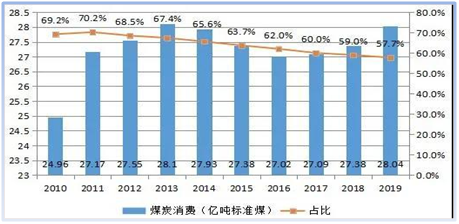 国家能源发展十三五规划:到2020年,能源消耗总量控制在50亿吨标准煤以内。2019年全国煤炭消费量约28.04亿吨标准煤,煤炭消费量占能源消费总量的57.7%。