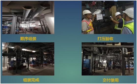 制冷机房BIM+工厂预制化装配式施工,采用工厂流水线化预制加工工艺,代替传统的工人现场制作,实行工厂预制、现场装配,在预制加工厂集中进行文明施工和安全管理,减少发生安全事故的不确定因素,现场施工垃圾减少80%,现场装配工序更加程序化、标准化、简单化,避免长时间高强度的高空作业和交叉施工,减少发生生产安全事故的概率,并且完美实现了场内“零焊接”的绿色环保作业,全面提高了生产效率和施工质量。