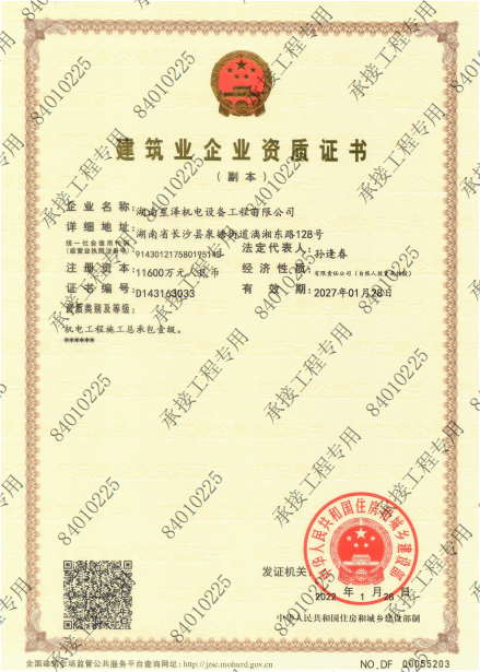 2022年1月29日,从国家住房和城乡建设部发布的《住房和城乡建设部关于核准2022年度第一批建筑工程企业资质名单的公告》(中华人民共和国住房和城乡建设部公告第 17号令)中获悉,经中华人民共和国住房和城乡建设部批准,湖南星泽 机电设备工程有限公司成功晋升为机电工程施工总承包一级资质!