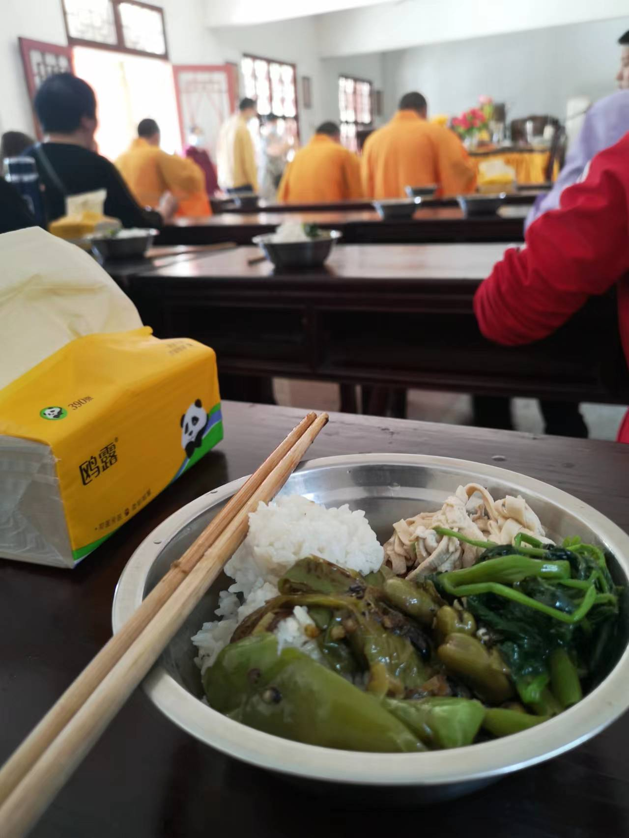 已到正午时分,僧人和修持者早课正好完毕。人总是要常怀善念和慈悲之心,功德箱里去尽份心意,有侍者见到,忙作揖谢过,并没有见我行跪拜菩萨,就觉得有点怪,但她也不知道我信仰的。看到中午僧饭开始,我入得堂内想看过究竟,僧人们又正在唱诵经文,猜想可能是什么神农五谷经之类,应该是感恩大地所赐五谷,让众生得以生存。大住持还用筷子和汤匙,挑上几粒米饭,在众僧们的唱诵下送出门外,转回来时不见饭粒,想必是他们感恩回馈,或许,是照顾其他众生,如猫狗老鼠蝼蚁之类生灵,给予它们一些生存的食物,看来,此举就可以说证得“众生平等,普渡众生”佛法,看来菩萨边鬼也喜欢的。为了体验庙堂斋饭,我便使出孙行者头衔向负责饭堂的管理乞讨一顿斋饭,她看我一个人并就答应了,安排好饭桌,像众僧们一样等待施饭,这里吃饭的主要是僧人,另外就是习佛修行的信众和居士,大家都安静的坐着,好像小学生等老师来上课。在施饭者挨个进行时,看到僧人们个个双手合十,点头谢过,此情此景让人好生感动。每施到我,一股油然而生的感恩之情溢于言表,不禁也双手合十,点头感恩。虽是斋饭,但色香味美不失家常,只是不荤罢了,菜品和味道让我来了一次光盘行动,对锄禾之辛苦体会更深了,因不劳而获的幸运让我动容。
