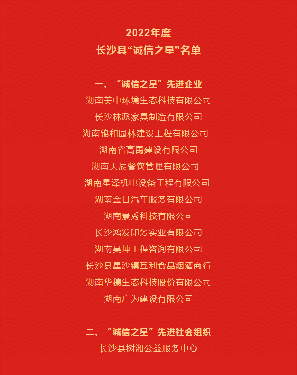 12月1日,长沙县2022年“诚信之星”名单正式公布。经长沙县社会信用体系建设领导小组办公室批准,授予湖南锦和园林建设工程有限公司等13家单位“诚信之星”先进企业称号,授予长沙县树湘公益服务中心“诚信之星”先进社会组织称号,授予黄明海等9名同志“诚信之星”先进个人称号。
