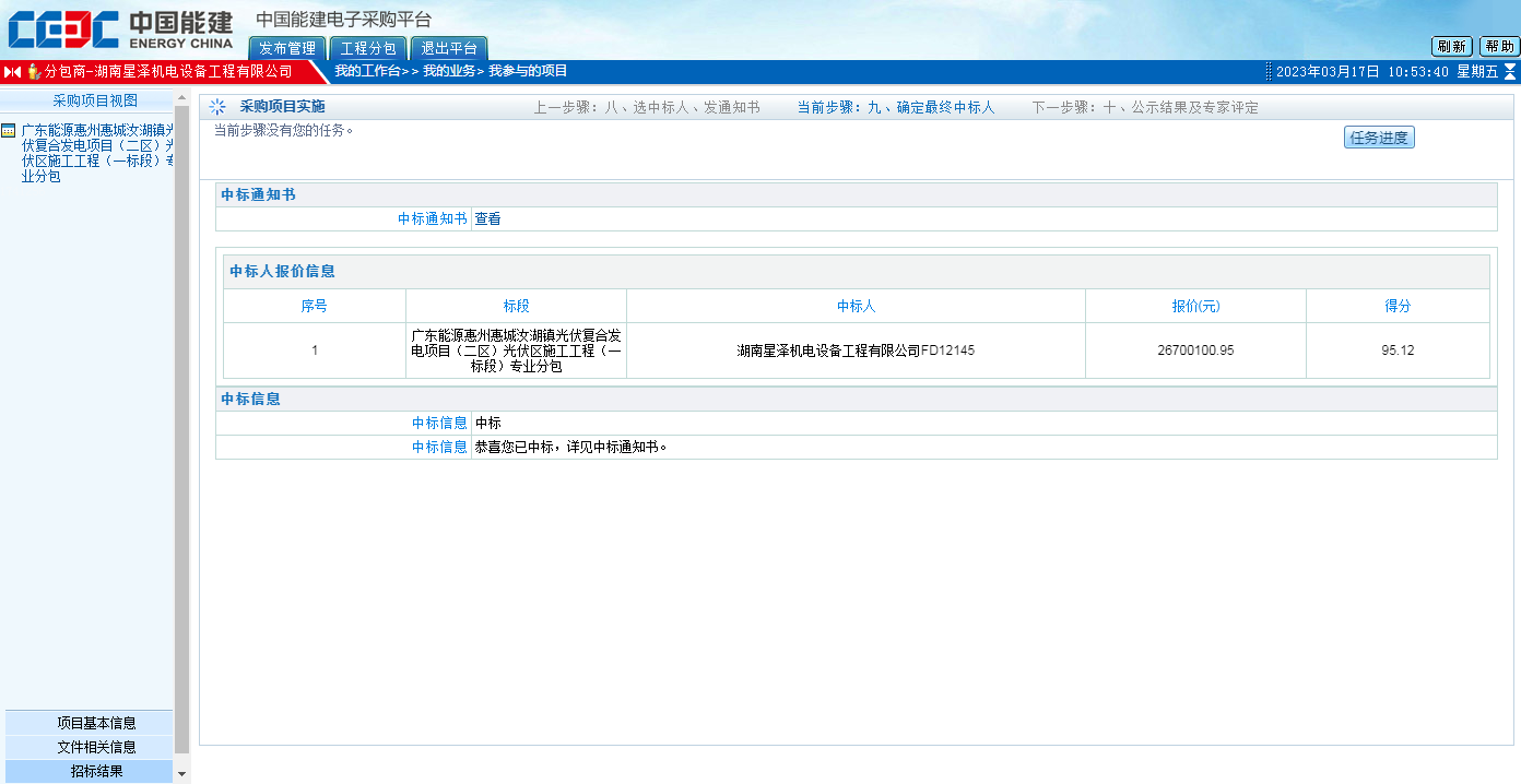 17日,公司从中国能建电子采购平台获悉我公司在广东能源惠州惠城汝湖镇复合发电工程(二区)光伏区施工工程(一标段)专业分包工程中成功中标,标的金额2670万。我公司自2017年涉足新能源行业以来,屡获佳绩,连续五年多次中标光伏项目。