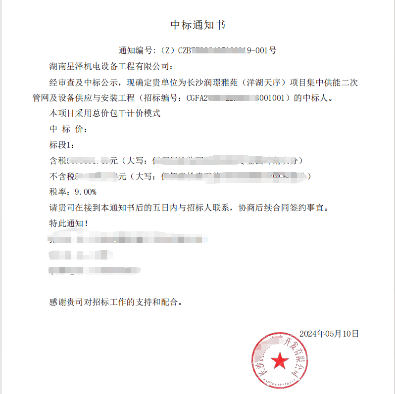 5.10星泽公司再中一标——长沙洋湖片区天序项目集中能源供应管网与设备安装工程,付出与收获是成正比的。我们不断接受挑战,不断迎接挑战,以人为本,诚信为道,勇于担当,再创辉煌!