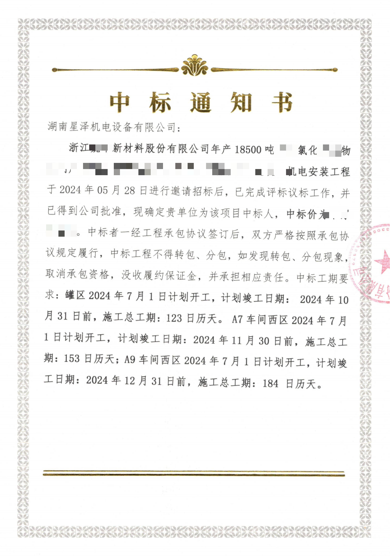 2024年6月13日,公司成功以1300万投标报价,成功中标浙江一新材料公司18500吨氯化工项目机电安装工程。