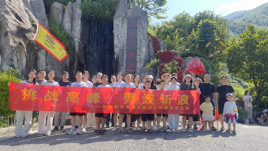 7月26日清晨,在“挑战高峰,劈波斩浪”的醒目横幅下,湖南星泽 公司管理部全体员工携家属奔赴浏阳周洛大峡谷,用一场清凉而澎湃的团建,把口号写进了山谷与浪花。
