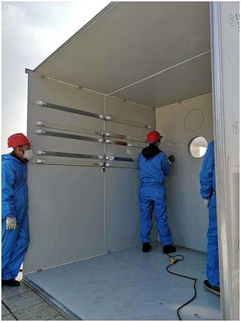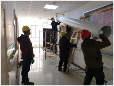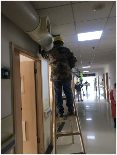 本项目是作为冠状病毒隔离病房使用,公司接到任务时,限时三天要完成施工,是一个应急性施工任务;我公司负责的是本项目的新风系统施工,为给工作人员健康舒适的工作环境,隔离病房楼内公共区域需供提新风,保持正压。
