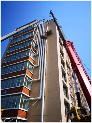4、本工程的工作难点是外墙风管的施工安装,外墙管道最高处有35m高,因此,所有外墙管道、支架需借助吊车辅助施工。